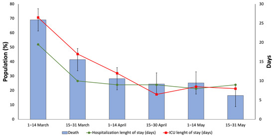 The mortality rate has decreased from 1 March 2020 and 15 March 2020, (69.05%) to 15 May 2020 and 31 May 2020 (16.55%). The hospital and ICU length of stay also decreased throughout the study period, from a median of 19.5 to 9 days and 26.5 to 8 days, respectively (Figure 1).