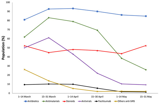 Between 1 March 2020 and 31 May 2020, the use of antibiotics and steroids remained stable. On the other hand, a decrease in the use of antimalarials (61.9–25.9%), antivirals (50–9.35%), tocilizumab (9.52–1.44%), and other anti-SIRS, especially interferon beta (26.19–1.44%) was observed (Supplementary Materials Table S2 and Figure 2).