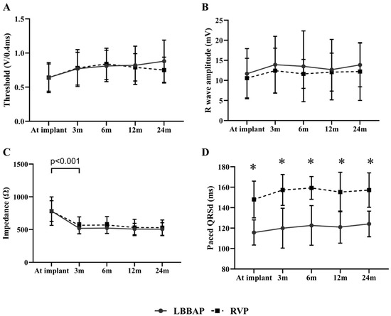 Comparison of pacing parameters between LBBAP and RVP at baseline and during follow-up. (A,B) LBBAP (solid line) produced stable capture thresholds and R wave sensing amplitudes comparable to RVP (dashed line) at baseline and during follow-up; (C) Both groups demonstrated a significantly decreased pacing impedance three months post-implant (p < 0.001) and then remained stable during follow-up; (D) LBBAP presented with a narrowed paced QRS duration than RVP did. The difference in QRS duration persisted between two groups during follow-up (p < 0.001); LBBAP = left bundle branch area pacing; RVP = right ventricular pacing.