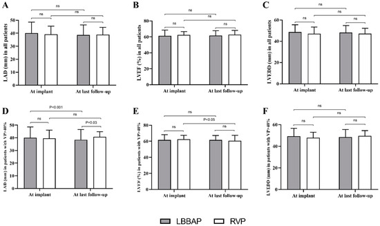 Echocardiographic measurements between LBBAP and RVP at baseline and during follow-up. (A–C) There were no significant difference in cardiac structure and function between LBBAP and RVP group during follow-up (all p > 0.05); (D–F) Among patients with VP% > 40%, decreased LAD (40.1 ± 8.5 mm at implant vs 38.5 ± 8.0 mm at last follow-up, p < 0.001) and LVEF (62.7 ± 4.8% at implant vs 60.5 ± 6.9% at last follow-up, p < 0.001) were observed in LBBAP group and RVP group, respectively; ns = non-significant; LBBAP = left bundle branch area pacing; RVP = right ventricular pacing; LAD = left atrial diameter; LVEF = left ventricular ejection fraction.