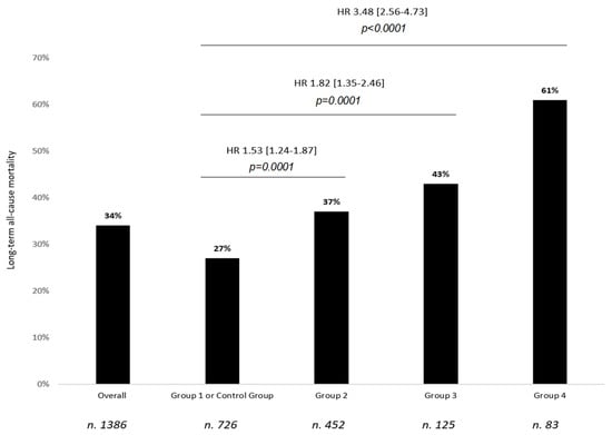 | Atrial fibrillation groups (Group 1 as reference) | |||