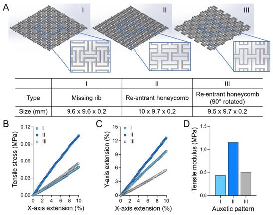 Finite element analysis of auxetic patches for the three different patterns. (A) Auxetic patch structures of orthogonal missing rib (I), 0° (II), and 90° (III) rotated re-entrant honeycomb; (B) Stress–strain and (C) X vs. Y extension curves of auxetic patches; (D) Tensile modulus of auxetic patches by patterns.