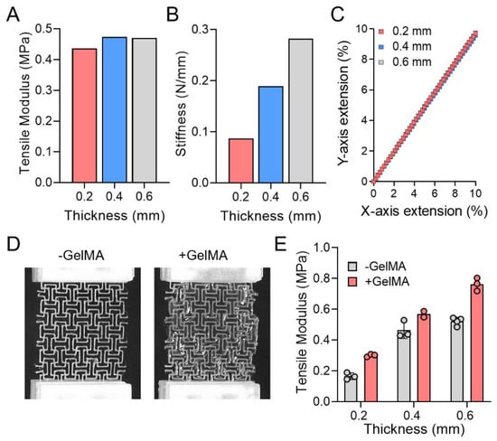 Mechanical properties analysis of orthogonal missing rib substrates according to the different thicknesses and GelMA application. (A) Tensile modulus of missing rib substrates by thickness; (B) Stiffness and (C) X vs. Y extension curves of missing rib substrates by thickness. (D) Tensile test and (E) modulus of missing rib substrates with and without GelMA application. Mean ± SD.