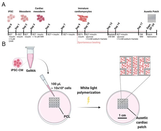 Cardiomyocyte incorporation into the auxetic patch. (A) Schematic timeline of Wnt-modulated cardiac differentiation and subsequent glucose starvation; (B) Fabrication process of auxetic cardiac patch composed of PCL and GelMA.