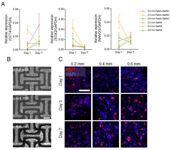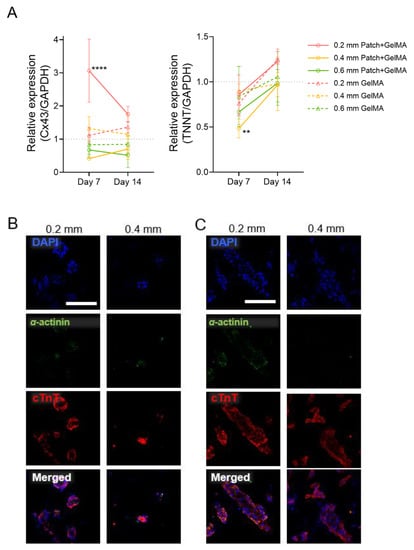 Gene expression for Cx43 (connexin 43) and TNNT (cardiac troponin T) was performed to examine the induced cardiomyocyte expression over the 14-day culture in the PCL and GelMA patches compared to 2D-cultured cardiomyocytes (Figure 5A). Both markers showed expression relative to the cell-only induced cardiomyocytes in both day 7 and day 14 after embedding. Especially, among six groups, cardiomyocytes embedded in 0.2 mm patch + GelMA showed higher Cx43 and TNNT expressions. Next, two induced cardiomyocyte seeding densities were investigated for spatial organization for a static 14-day culture. In addition to the higher density of 100 million cells/mL, induced cardiomyocytes at a lower density of 10 million/mL were incorporated into GelMA, and then used to fill 0.2 and 0.4 mm thicknesses of 3D printed PCL substrate, following previous methods. Immunofluorescent staining for cardiac troponin T and α-actinin displayed both groups of densities clustering of nuclei and spatial aggregation of the cells in the gel (Figure 5B,C).