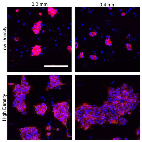 Maximum intensity projections from z-stacks of 0.2 and 0.4 mm high density and low density patches with iPSC-CMs stained against cardiac troponin T (red) and nucleus (blue) at day 14 of culture. Scale bar = 100 µm.
