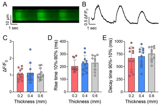Calcium transients of day 7 high density iPSC-CM laden auxetic patches with three thicknesses. (A) Representative line scan from spontaneously beating iPSC-CMs in the patch; (B) Corresponding fluorescence trace; (C) Calcium transient amplitudes, (D) rise times, and (E) decay times for 0.2, 0.4, and 0.6 mm thickness patches. Mean ± SD.