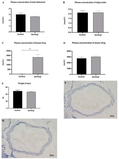Biochemical and ELISA analyses of plasma. Plasma concentration of total cholesterol (A), triglycerides (B), human sEng (C), mouse sEng (D), and weight (E) in Sol-Eng+ mice and control group. Representative microphotographs of hematoxylin-stained aortas from control group (F) and Sol-Eng+ (G) mice. Data are shown as a mean ± S.E.M., Mann–Whitney test, ** p ≤ 0.01. n = 6 mice per group.