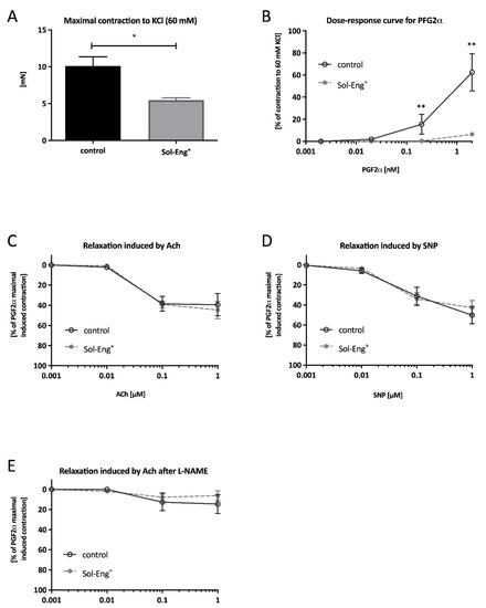It was well established that Sol-Eng+ mice are hypertensive [26]; however, the precise mechanism of arterial hypertension development is still unknown. In this study, the analysis of vasoconstriction properties of the aorta revealed reduced contractile capacity after KCl and PGF2α in Sol-Eng+ mice. Potassium chloride (KCl) is involved in the activation of voltage-operated Ca2+ channels resulting in elevation of Ca2+ concentration in the cytosol [30]. This stimulus leads to phosphorylation of the myosin light chain with subsequent contraction [31]. Prostaglandin F2 alpha (PGF2α) stimulates vasoconstriction through PGF2α receptor localized in smooth muscle cells [32]. Even though the aorta is not a crucial vessel regulating blood pressure, we might speculate that the aorta of Sol-Eng+ mice that are hypertensive is already in a higher contractility state, therefore, cannot be contracted by KCl and PGF2α. This suggests impaired vasoconstriction and inability to maintain vascular tone after long-term exposure to high sEng levels.