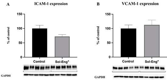 Expression of endothelial adhesion molecules in aortas of twelve-month-old male Sol-Eng+ and control mice. Expression of ICAM-1 (A) and VCAM-1 (B) in total protein extract from mice aortas. Densitometric quantification of immunoreactive bands (top panel: densitometric analysis, control = 100%) was recalculated to the GAPDH signal (bottom panel: representative immunoblots). Data are shown as a mean ± S.E.M, Mann–Whitney test. n = 5 mice per group.