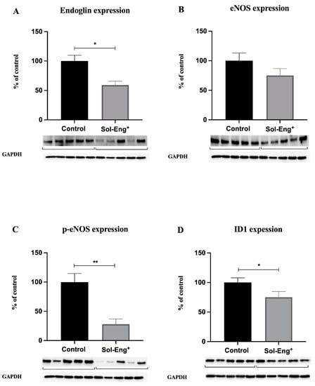 We aimed to evaluate the effects of high sEng levels with respect to endoglin-related signaling, including eNOS, p-eNOS, and Id1. Western blot analysis revealed significantly decreased protein expression of membrane endoglin (to 59%, Figure 4A) and p-eNOS (to 28%, Figure 4C) in the Sol-Eng+ group compared to the control group, suggesting altered endoglin signaling. On the other hand, as shown in Figure 4B, eNOS protein expression did not reach statistical significance between the groups. In addition, significantly decreased expression of ID1 was observed in the Sol-Eng+ group compared to the control group (to 75%, Figure 4D), suggesting reduced Eng signaling.