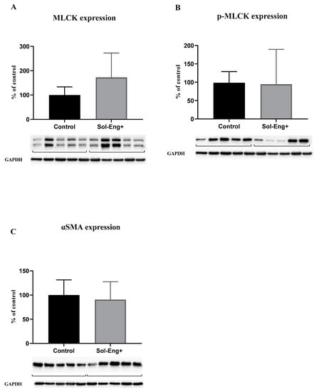 Myosin light chain kinase (MLCK) protein levels in the aorta were evaluated in order to reveal the potential impact of sEng on vascular contractility. To express the real activity and contribution of MLCK to vasoconstriction capability, we determined the expression of MLCK (Figure 5A) and its phosphorylated form (Figure 5B). As shown in Figure 5A,B, the Sol-Eng+ group has a similar expression of MLCK and p-MLCK as the control group.