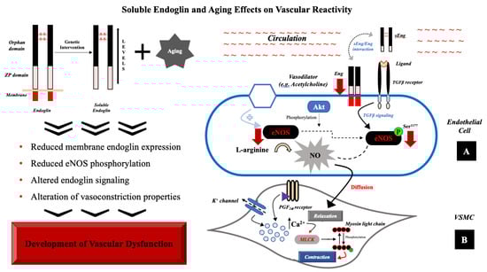 Role of sEng with aging in vascular dysfunction. (A) In endothelial cells, sEng and aging reduce Eng expression (red arrow) and signaling resulting in reduced expression of eNOS (red arrow) and its reduced phosphorylation rate (red arrow). (B) Vasoconstriction process, localized in VSMC, consists in phosphorylation of myosin light chain by an activated form of myosin light chain kinase (MLCK). Binding to PGF2α receptor or activation of K+ channel evoke changes in intracellular milieu, increasing calcium ion concentration. The presence of high levels of sEng and aging probably contribute to the alteration of vasoconstriction.