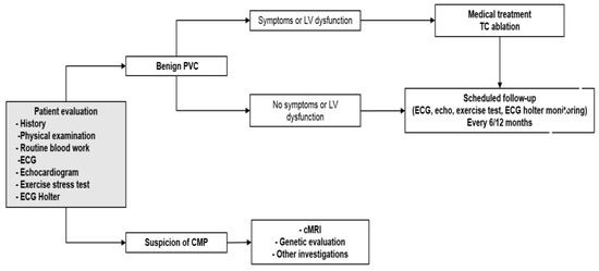 Diagnostic workflow of patients with premature ventricular contractions. Legend: CMP: Cardiomyopathy; cMRI: Cardiac magnetic resonance imaging; ECG: electrocardiogram; LV: left ventricular; PVC: Premature ventricular contractions; TC: transcatheter.