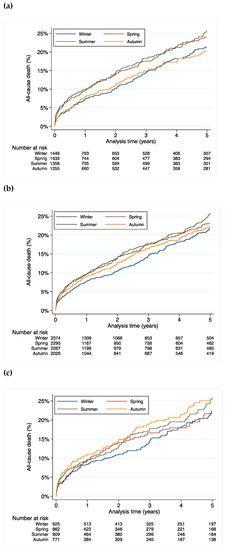 All-cause mortality stratified by season of birth for (a) all patients, (b) male patients and (c) female patients.