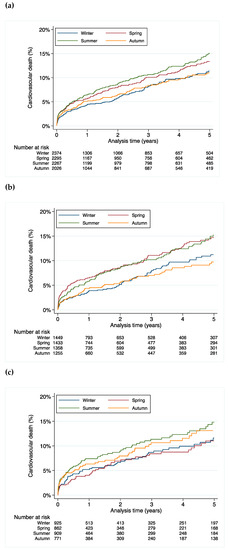 Cardiovascular mortality stratified by season of birth for (a) all patients, (b) male patients and (c) female patients.