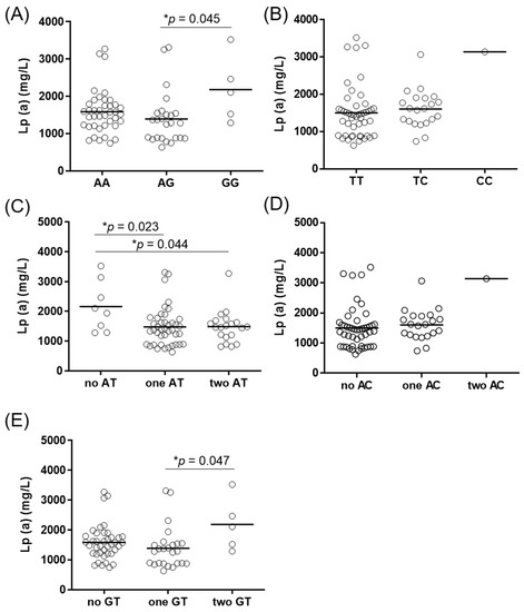Haplotypes AT (Figure 1c) and GT (Figure 1e) showed statistically significant associations with Lp(a) levels, while no difference in Lp(a) levels was observed for the haplotype AC (Figure 1d). Patients with no AT haplotype were shown to have significantly higher Lp(a) levels in comparison with carriers of one AT haplotype (2158 mg/L versus 1478 mg/L, p = 0.023) or two AT haplotypes (2158 mg/L versus 1487 mg/L, p = 0.044). There was only one patient with both AC haplotypes in this study (Figure 1d), who had high Lp(a) levels (3143 mg/L). Thus, no statistical analysis was performed in comparison with those with no (1504 mg/L) or one (1608 mg/L) AC haplotype. Similarly, patients with both GT haplotypes had higher Lp(a) levels (2180 mg/L) in comparison with those with one (1391 mg/L, p = 0.045) GT haplotype. The difference in Lp(a) levels between those with both GT haplotypes and none (1586 mg/L) was not significant (p = 0.170). These data show that GT might be a risk haplotype for higher Lp(a) levels, while the presence of one or two copies of the AT haplotype appears to be protective from high Lp(a) levels, even in patients with very high Lp(a) levels.