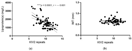 Lp(a) levels were inversely correlated with the number of KIV-2 repeats (r = −0.601; p < 0.0001) (Figure 2a). The number of KIV-2 repeats explained 36% of all of the variations in the population. In patients with KIV-2 repeats below the median (10.2), the Lp(a) levels were significantly higher compared with those with KIV-2 repeats above the median (1690 mg/L versus 1282 mg/L, p < 0.0001, Table 4). There were no differences in the levels of other lipids between these two groups of patients with KIV-2 repeats below and above the median (Table 4).