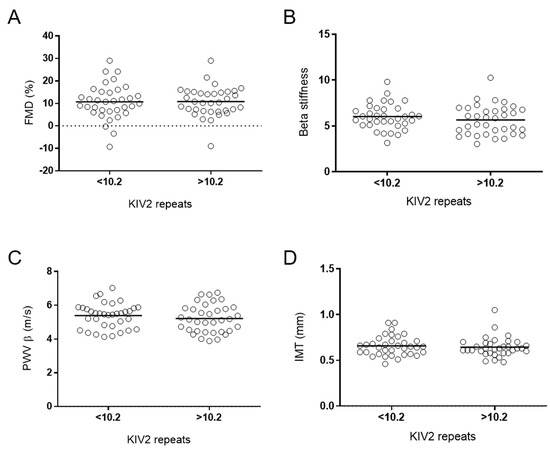 Morphological and functional parameters of arterial wall and KIV2 repeats. Morphological and functional parameters were compared between two groups of KIV2 repeats based on the median of KIV2 repeats, i.e., 10.2, using Student’s t-tests. (A) FMD, flow-mediated dilatation; (B) beta stiffness; (D) IMT, intima–media thickness; (C) PWV β, pulse wave velocity β.