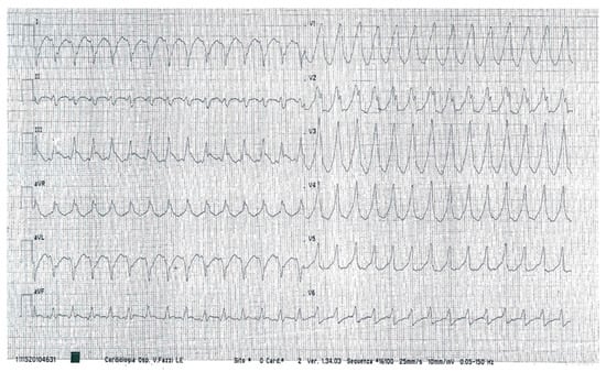 The patient was taken to another hospital while suffering from acute chest pain, which was complicated by cardiac arrest (ventricular fibrillation). He immediately underwent a coronary angiography (negative for new coronary stenoses), and he was implanted with a bicameral implantable cardioverter defibrillator (ICD) a few days later. During a subsequent hospitalization, he had unfortunately received several shocks from the ICD as a result of sustained ventricular tachycardia (Figure 1), despite receiving antiarrhythmic drug therapy (metoprolol 100 mg die, amiodarone 200 mg die, magnesium sulfate, and potassium chloride via continuous i.v. infusion).