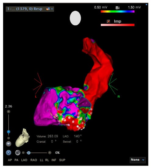 At admission to our hospital, his clinical condition was critical: he could not breathe without ventilatory support (NPPV—Non-Invasive Positive Pressure Ventilation) and he demonstrated continuous electrical status instability. A transthoracic echocardiogram was performed. Despite severe mitral regurgitation, the left ventricular ejection fraction was reduced (estimated at 40%). We decided to perform a ventricular tachycardia ablation [], using cardiopulmonary support by means of extracorporeal membrane oxygenation (ECMO), because of the hemodynamic instability of the patient during arrhythmia []. The use of the ECMO system secured hemodynamic stability throughout the procedure; therefore, the ECMO system facilitated the creation of an accurate voltage mapping of the patient’s heart and the ablation of the unstable ventricular arrhythmias. Low-voltage areas were identified in the lateral basal, inferolateral basal, and posterior zone of the left ventricle of our patient, and radiofrequency erogations were applied in these areas (Figure 2).