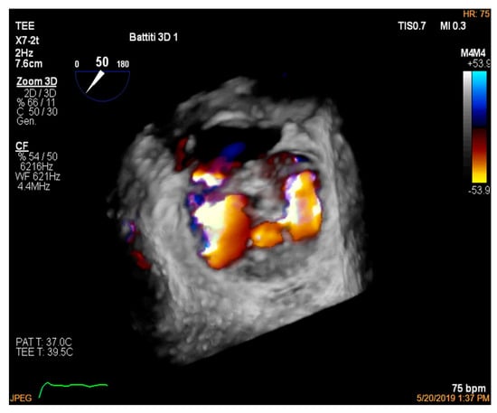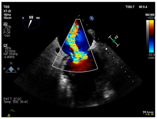 After the patient had been clinically and electrically stable for one week, the patient was discharged and prescribed optimized heart failure therapy (metoprolol 200 mg die, furosemide 350 mg die, ramipril 5 mg die, potassium canrenoate 100 mg die). Two weeks later, he returned to our hospital, and we performed a percutaneous mitral regurgitation correction procedure with a double MitraClip placement, which was performed using a transesophageal echocardiographic guide [,,]. The procedure achieved a mitral insufficiency reduction, with a decrease from grade IV to grade I being observed, and a final transvalvular mean mitral gradient (PGMm) of 4 mmHg (Figure 4).