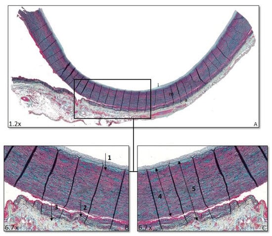 - Halushka, M.K.; Angelini, A.; Bartoloni, G.; Basso, C.; Batoroeva, L.; Bruneval, P.; Buja, L.M.; Butany, J.; D’Amati, G.; Fallon, J.T.; et al. Consensus statement on surgical pathology of the aorta from the Society for Cardiovascular Pathology and the Association For European Cardiovascular Pathology: II. Noninflammatory degenerative diseases—nomenclature and diagnostic criteria. Cardiovasc. Pathol. 2016, 25, 247–257. [Google Scholar] [CrossRef]