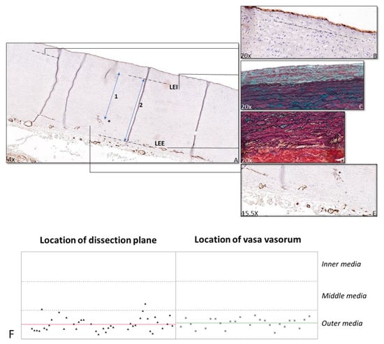 A further remarkable observation was the uniform localization of the dissection plane (a preferential position in the outer media was reported in two earlier reports) [23,24]. The more detailed analysis herein shows that the dissection plane consistently co-localizes with the plane of the vasa vasorum network in the outer media.
