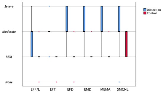 Graph of median morphology scores comparing the dissection and control group. Boxplot of median morphological scores comparing the dissection and control group. Boxes represent median morphological score (bold horizontal lines) and interquartile ranges (75%; 25%). Extremes are presented as asterisks. Blue corresponds to the dissection group and red to the control group. EFF/L: elastic fiber fragmentation/loss; EFT: elastic fiber thinning; EFD: elastic fiber degeneration; OMD: overall medial degeneration; MEMA: mucoid extracellular matrix accumulation; SMCNL: smooth muscle cell nuclei loss.