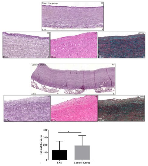 Wall thicknesses in TAAD and control were similar, but the intimal thickness was consistently less in the TAAD group (mean thickness 131 ± 122 μm (mean ± sd) vs. 193 ± 132 μm (mean ± sd) in the control group (p = 0.044) (Figure 4). Intimal thickness of the 6 patients with Marfan syndrome or BAV disease included in this study was 47 ± 29 μm (mean ± sd). After excluding the BAV and MFS patients from the TAAD group, the intima was still significantly thinner than in the control group.