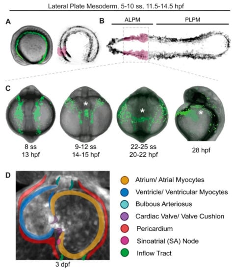 Within the LPM, the emergence, patterning, and migration of cardiac progenitors is trackable in real time through fluorescent transgenic reporters based on isolated gene-regulatory elements. Transgenic zebrafish have become widely applied in vivo tools thanks to easily available and universal plasmid collections, genetic methods to track and perturb cell lineages, and advances in live imaging of developing embryos using confocal, spinning disk, or light sheet microscopy [,,,,,]. Previously confined to cell-based labeling, transgenic marking of the cardiovascular lineage-forming LPM and its divergent cell lineages has enabled live imaging and isolation of the earliest stages of cardiac progenitor formation. The regulatory elements of the zebrafish gene drl [] established an early genetic marker for the developing LPM starting from 8 hpf onwards and that subsequently labels cardiovascular lineages including the prospective cardiac progenitors (Figure 1A,B) []. Cre/lox-based lineage tracing using drl-based transgenic reporters and live imaging of the emerging LPM from gastrulation stages have provided new insights into the context of heart development embedded within its adjacent LPM lineages [,,]. Gene-regulatory elements of the mouse Smarcd3 gene [] have been successfully harnessed to generate an early LPM-marking transgenic reporter in zebrafish that includes cardiac progenitors []. Fluorescent color variants of transgenic reporters based on subsequently expressed cardiac genes have generated a repository of tools for the field, including reporters based on myl7, kdrl, elnb, tbx1, nppa, and more that have unveiled distinct processes of heart development [,,,,,,]. Larger BAC-based transgenes have especially provided groundbreaking reporters for key cardiac genes including nkx2.5, gata5, hand2, and tbx5 that were applied in the study of early ALPM partitioning and patterning of the heart [,,,]. With increased efforts to discover gene-regulatory elements and the prospect of targeted knock-in approaches, we are in a highly productive time for the generation of new transgenic zebrafish reporters to visualize heart development and related processes, as well as to unravel the upstream regulation of unique gene-regulatory programs driving heart formation.