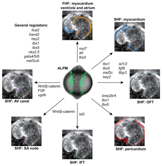 Of particular interest for zebrafish SHF development are the Islet family transcription factors Isl1 and Isl2, the study of which has revealed new layers in SHF differentiation and proliferation. In mice, Isl1 gene expression demarcates SHF progenitors and its loss results in atrial and ventricular defects of SHF-derived lineages [,,,]. Consequently, several studies have addressed the expression and functional involvement of the isl genes in zebrafish SHF formation, with isl1 becoming a frequent marker for the highly migratory SHF-derived progenitors at the venous pole and inflow tract structures [,,]. As is common for gene paralogs in zebrafish as the result of the teleost-specific whole-genome duplication in the last common ancestor of bony fishes [], the Isl paralogs isl1a, isl1b, isl2a, and isl2b have acquired regionalized functions, and the OFT and arterial pole require isl2b for their proper formation []. These findings further revealed isl2b as acting upstream of various cardiac transcription factor genes including mef2c genes, hand2, and tbx20, connecting the activity of regional progenitor programs to broad-acting effectors []. The LIM domain-binding protein ldb1 regulates differentiation of the isl1-expressing cardiomyocytes at the venous pole [], while the LIM domain protein Ajuba restricts Isl protein activity as a downstream effector of RA signaling [] and Nkx2.5 and Nkx2.7 have been implicated in repressing isl1 at the venous pole []. These studies reveal a fine-grained early control of ALPM progenitors that form the heart that goes beyond a merely FHF versus SHF patterning choice. Together, this striking regionalized gene regulation suggests that molecular differences between FHF and SHF progenitors, despite their seemingly fluid transition in forming the heart, are engrained early on in development by yet-to-be revealed mechanisms and evolutionary origins.