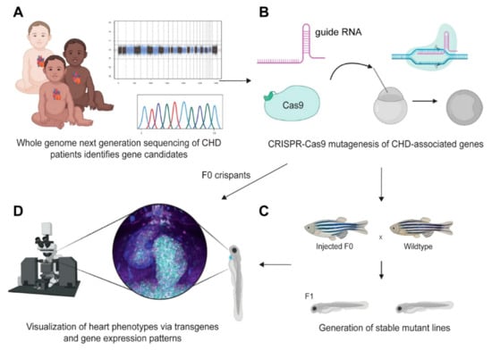 Notably, the majority of mutations linked to CHDs have been found to be heterozygous in humans, but their orthologs behave as recessive mutants in zebrafish and also mouse models [,,]. Somatic mutagenesis of candidate genes through maximized CRISPR-Cas9 efficiency enables first phenotype assessment in F0 embryos, so-called crispants []. Crispants enable testing of individual candidate genes or even screening [,,,,,]; however, the phenotypic variability observed due to incomplete saturation and mutational mosaicism warrants follow-up with germline mutants for reproductible, sustained validation (Figure 3). Further, due to the teleost-specific, additional round of whole genome duplication, mutations affecting all orthologs and possibly paralogs of a human CHD candidate gene might be needed in zebrafish at times to circumvent possibly compensatory effects. Despite these caveats, the developmental knowledge and in vivo means as outlined throughout this review render zebrafish ideally situated to act as the first discovery platform for causally connecting genetic lesions with developmental cardiac anomalies.