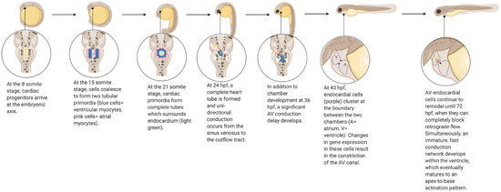 Zebrafish have long been used as a model to study molecular pathways in developmental biology, particularly as they apply to human cardiovascular disease [10]. As in humans, the zebrafish heart develops from a heart tube derived from cardiac progenitors [11] (Figure 1). Unidirectional electrical conduction begins at 24 h post-fertilization (hpf), and the heart tube begins to loop shortly thereafter at 30 hpf, forming distinct chambers [11,12]. Atrioventricular valve formation occurs around 43 hpf, and continues to develop until 72 hpf, at which point valve leaflets are able to completely block retrograde flow [13,14,15]. From this point onwards (72–96 hpf), an immature fast conduction network develops within the ventricle, which eventually fully matures to an apex-to-base activation pattern when the ventricular apex has formed [12]. Cardiogenesis in mammals and zebrafish requires many of the same essential genes and regulatory networks; however, the zebrafish requires much less time than humans to complete these events [10]. Though there are clear structural differences between the four-chamber human heart and the two-chamber zebrafish heart, a high degree of genetic orthology between the two species, combined with high fecundity and easy visualization of phenotypes, render the zebrafish a desirable model for studying a wide variety of cardiovascular processes and pathologies.