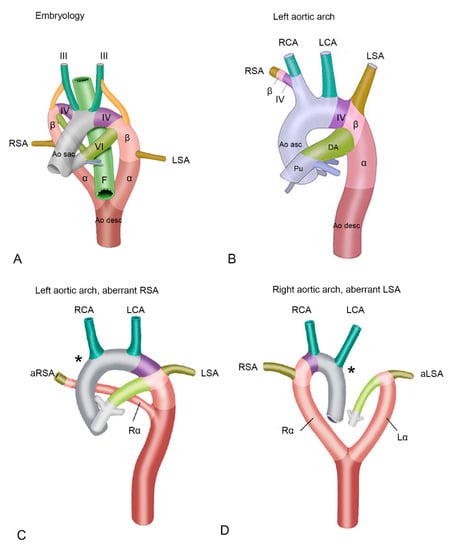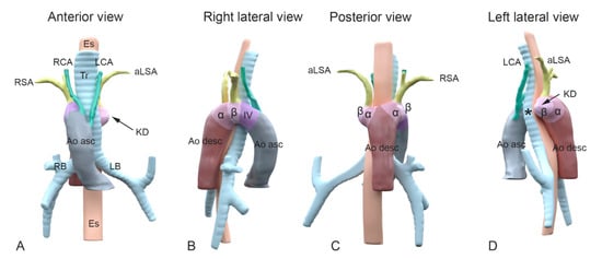- Bergwerff, M.; DeRuiter, M.C.; Hall, S.; Poelmann, R.E.; Groot, A.C.G.-D. Unique vascular morphology of the fourth aortic arches: Possible implications for pathogenesis of type-B aortic arch interruption and anomalous right subclavian artery. Cardiovasc. Res. 1999, 44, 185–196. [Google Scholar] [CrossRef]