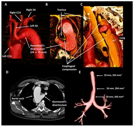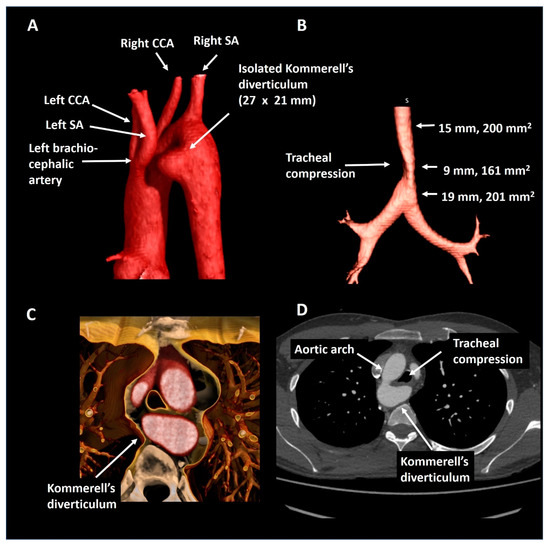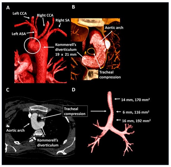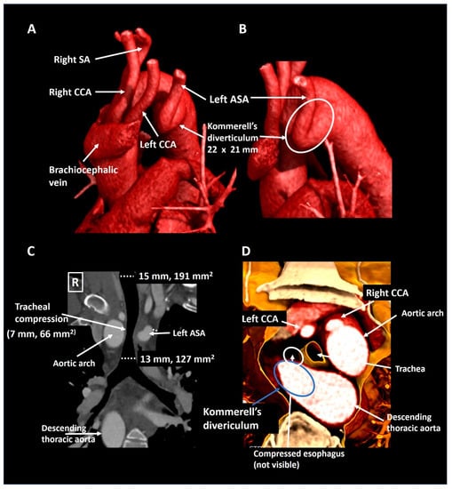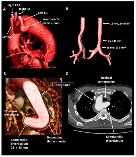 - Backer, C.L.; Bharadwaj, S.N.; Eltayeb, O.M.; Forbess, J.M.; Popescu, A.R.; Mongé, M.C. Double Aortic Arch With Kommerell Diverticulum. Ann. Thorac. Surg. 2019, 108, 161–166. [Google Scholar] [CrossRef] [PubMed]