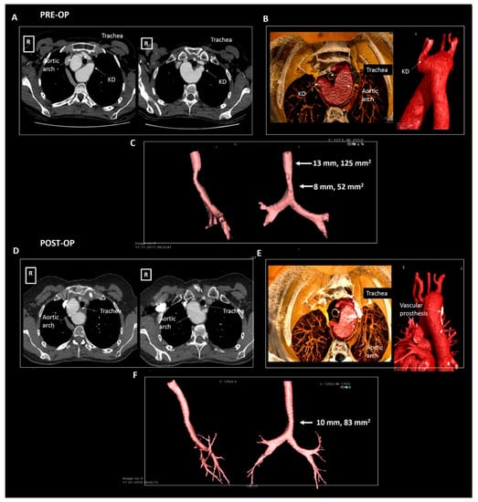Patient 3. Panels (A–C) pre-operative imaging, panels (D–F) post-operative imaging. Panel (A) shows the axial reconstructions illustrating a right-sided aortic arch, aberrant left subclavian artery and a Kommerell’s diverticulum compressing the trachea and esophagus. Panel (B) shows the volume rendering images and panel (C) depicts the compressed trachea. Panel (D) shows the post-operative result after surgical resection of the Kommerell’s diverticulum in axial reconstructions and panel (E) in volume rendered reconstructions. Panel (F) depicts the trachea, illustrating some increase in tracheal dimensions. KD, Kommerell’s diverticulum.