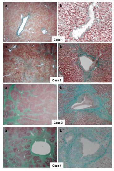Liver histopathology obtained at autoptic examination by Masson’s Trichromic staining: (a) a panoramic view (×10 magnification) and (b) close up view (×40 magnification). In particular, the marked distortion of the liver structure, with fibrotic bridges arising from centrilobular veins and involving sinusoidal spaces and portal tracts, can be seen. Note the increasing thickness of fibrotic septa from Cases 1 to 4, so as to manifest the characteristic condition of “reverse cirrhosis”; moreover, in Case 4, the presence of cholestasis also resembles the so called “nutmeg pattern”.