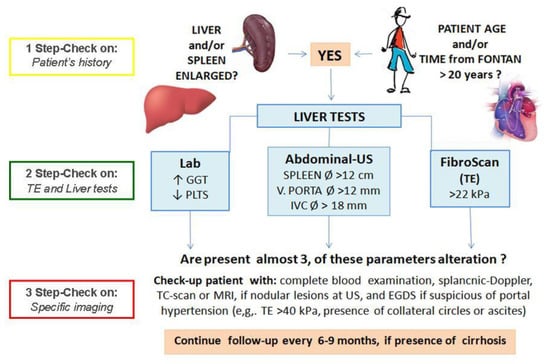 Therefore, we believe, that TE still remains a practical and easy method to non-invasively distinguish between cases with and without progressive FALD. We found the LS follow-up to be a very useful and prognostic tool to monitor the related signs to Fontan circulation failing [15] and liver damage promotion in cases with Fontan circuit [16], particularly when found over the cut-off value of 22 kPa. Moreover, higher SS values appeared significantly related to the bleeding risk (as in Cases 2 and 3) [17]. Thus, we propose introducing TE for the evaluation of both congestion and fibrosis components of the liver and for the definition of portal hypertension, as part of the routine Fontan patients’ clinical follow-up (see Figure 2), reserving a secondary role of the liver biopsy in this peculiar cohort.
