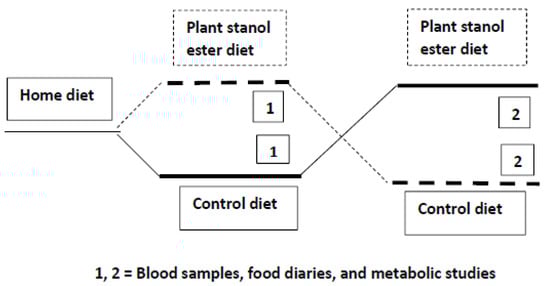 In brief, after a run-in period on their regular home diets, the subjects replaced in a randomized order 21 g of their daily total fat intake with a rapeseed oil-based margarine without (control diet) or with plant stanol ester (3 g plant stanols/day)(plant stanol ester diet) for seven weeks, followed by switching of the margarines for another 7-week period without a wash-out period. Since an earlier plant stanol ester intervention has demonstrated that a steady state is achieved within 1–2 weeks without any carry-over effect [], a wash-out period was considered unnecessary in this 7 + 7- week intervention. The plant stanols were mainly comprised of sitostanol, the most frequent plant stanols in food. The subjects were advised to use margarine daily in three divided doses during each of the three major meals.