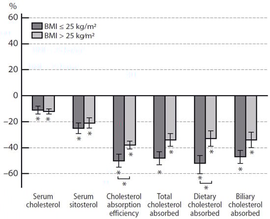 Obesity can affect the serum cholesterol and LDL-C responses in dietary interventions []. Thus, the substitution of unsaturated for saturated fatty acid intake reduced serum cholesterol, LDL-C, and apoprotein B (apo B) concentrations more effectively in normal-weight than in obese subjects []. The question arises of whether or not plant stanol esters lower serum cholesterol concentrations less in obese than in normal-weight subjects, since obesity markedly modifies cholesterol and LDL-apo B metabolism [,,,,].