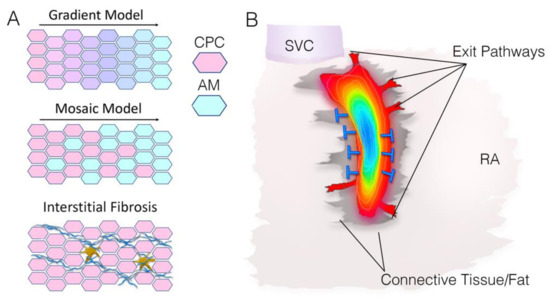 Models of sinoatrial node structure/function. (A) Graphical depictions of the Gradient Model, the Mosaic Model, and Interstitial Fibrosis. CPC—cardiac pacemaker cell, AM—atrial myocyte. (B) Diagram of sinoatrial node activation pattern (blue to red). Potential exit pathways to the atrial myocardium and connective tissue (grey) that serve as resistive barriers (blue lines) are indicated. SVC—superior vena cava, RA—right atrium.