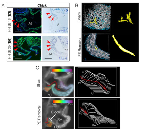 - Vicente-Steijn, R.; Passier, R.; Wisse, L.J.; Schalij, M.J.; Poelmann, R.E.; Gittenberger-de Groot, A.C.; Jongbloed, M.R. Funny current channel HCN4 delineates the developing cardiac conduction system in chicken heart. Heart Rhythm 2011, 8, 1254–1263. [Google Scholar] [CrossRef] [PubMed]