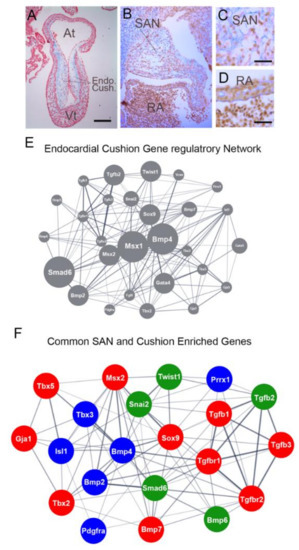 Genetic pathways active during sinoatrial node remodeling. (A) Sagittal section through an HH stage 19 chick heart stained with alcian blue (blue) which labels HA and nuclear fast red (red). Endocardial cushions are indicated. Scale bare—500 mm. (B) Section through the remodeling sinoatrial node of a chick embryo at HH stage 29. Sinoatrial node (SAN) and right atrium (RA are indicated). (C,D) Higher magnification images from (B). Scale Bars—50 mm. (E) Genes list was generated by comparing the Gene Ontology (GO) term Endocardial Cushion Development (0003197) with the gene regulatory networks published by DeLaughter et al. [149] and enriched genes from Schroeder et al. [150] and Singh et al. [151]. Node size reflects the number of data sets in which the indicated gene is present. Line thickness denotes confidence of potential interaction between genes [152]. (F) Comparison of genes identified as upregulated in the sinoatrial node based on sequencing studies from Vedantham et al., Bressan et al., and Van Eif et al. [104,128,129] Genes with greater than two-fold enrichment over atrial myocardium in all three data sets were compared to the gene-regulatory network for cushion formation in (D). Genes in blue nodes were enriched in all three RNA sequencing data sets, green nodes were present in two data sets, red nodes were detected in one data set.