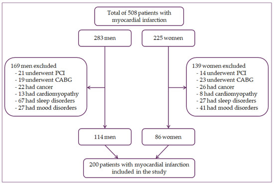A cross-sectional study was conducted, including 200 patients with myocardial infarction. Of these, 86 were women, and 114 were men. Subjects were patients with a history of myocardial infarction hospitalized at the University Hospital Osijek, Croatia. Patients with type I and II myocardial infarction with elevated cardiac troponin T above the 99th percentile were included in the study and with one of the subsequent factors: electrocardiogram (ECG) changes, pathological Q waves, myocardial ischemia symptoms, loss of viable myocardium or regional wall motion abnormalities, or coronary thrombus identified by angiography [29,30]. Patients were excluded from this study if they had undergone percutaneous coronary intervention (n = 35) or a coronary artery bypass (n = 42) because those are not clinical characteristics of acute MI. Additionally, patients were excluded if they had cancer (n = 48), cardiomyopathy (n = 21), or other circadian rhythm-regulated diseases, such as sleep disorders (n = 94) and mood disorders (n = 68), including depression (Figure 1).