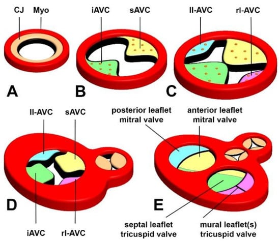 - de Lange, F.; Moorman, A.; Anderson, R.; Männer, J.; Soufan, A.; de Gier-de Vries, C.; Schneider, M.; Webb, S.; van den Hoff, M.; Christoffels, V. Lineage and morphogenetic analysis of the cardiac valves. Circ. Res. 2004, 95, 645–654. [Google Scholar] [CrossRef] [PubMed]