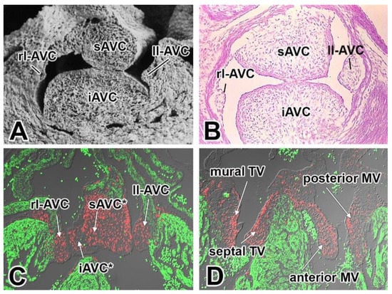In the human heart, we distinguish two AV valves. The left AV valve (or mitral valve) will develop in the left AV junction, whereas, in the right AV junction, the right AV valve (or the tricuspid valve) will appear. The (fused) major AV cushions mainly contribute to the AV valve leaflets that are associated with the ventricular septum (Figure 1). The lateral AV cushions (Figure 1 and Figure 2A–C) contribute to the leaflets that are attached to the left and right atrioventricular junction. Histological analysis indicates that the superior AV cushion forms the “anlage” of the anterior (or aortic) leaflet of the mitral valve. The posterior (or mural) leaflet of the mitral valve, however, derives from the left lateral AV cushion. At the right side of the heart, the inferior AV cushion provides the bulk of the septal leaflet of the tricuspid valve (Figure 1D,E and Figure 2C,D). With subsequent development, the valve leaflets further mature and become organized in three layers: the atrialis, spongiosa, and fibrosa []. Each layer comprises a specific extracellular matrix composition and valve interstitial cells, which are essential for proper function of the leaflets. Given the fact that a significant amount of research on the development of the AV valves and investigations on the molecular pathways and pathogenic events that underlie the diseases of these valves are conducted in mice, it is important to recognize that, whereas the general mechanisms that lead to the formation of the valves are quite similar between mice and humans, the ultrastructure of the developed leaflets differs significantly. For instance, the valves in the human heart are, at their distal ends, contiguous with the papillary muscles via long and numerous tendinous chords (known as the chordae tendineae), while, in the mouse, these tendinous chords are not as prominent []. Furthermore, the right AV valve in the mouse does not have the typical three leaflet configuration as observed in the human, but rather consists of only two leaflets [].