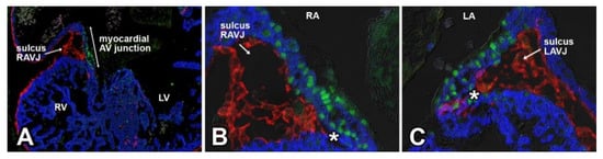 While the generation of EPDCs through epiMT takes place in all regions of the epicardium covering the chamber myocardium, it is more prevalent in the epicardium lining the ventricles than the epicardium on the atria. EpiMT is particularly prominent in the epicardium found at the AV junction. Here, the accumulation of extracellular matrix (ECM) and AV-EPDCs (as we will call this specific population of EPDCs in the AV junction in the rest of this contribution to differentiate them from the EPDCs in other parts of the heart) leads to the formation of the AV sulcus (Figure 3). As mentioned, the molecular regulation responsible for the formation of AV-ENDCs in the AV cushions has been studied in detail. The formation of AV-EPDCs in the AV sulcus has, however, not been studied to the same extent. As described above, the myocardial AV junction plays a crucial role in the regulation of endMT in the AV cushions. While there are many regulatory mechanisms involved in this process, TGFbeta2 [,] and BMP2 [,], in particular, are of particular importance as both are expressed at a relatively high level in the AV myocardium. In one of the following sections, we will come back to the role of growth factor signaling and epicardial development.