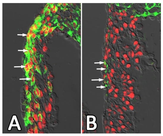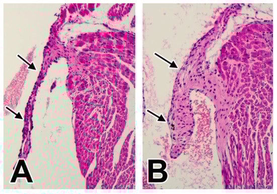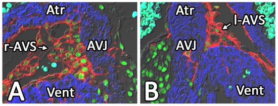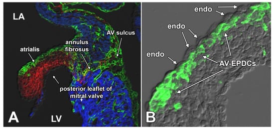 A specific feature associated with the contribution of AV-EPDCs into the cushions is that they position themselves right underneath the layer of valve endocardial cells that lines the atrial side of the developing leaflet. This part of the leaflet is, specifically in the human, typically referred to as the atrialis [] (Figure 4).