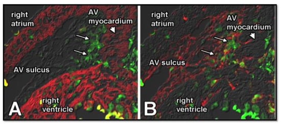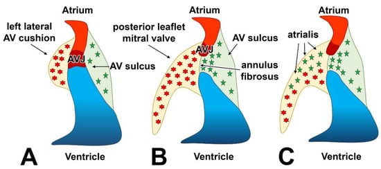- Wessels, A.; Markman, M.W.; Vermeulen, J.L.; Anderson, R.H.; Moorman, A.F.; Lamers, W.H. The development of the atrioventricular junction in the human heart. Circ. Res. 1996, 78, 110–117. [Google Scholar] [CrossRef]